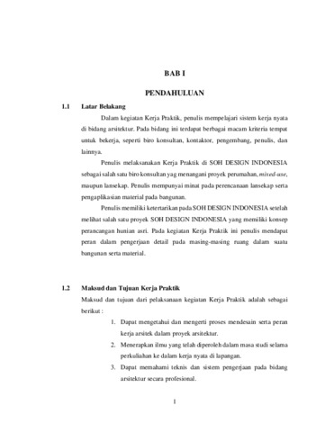 Penulis memiliki minat pada bidang arsitektur pada perencanaan lansekap dan pengaplikasian material di dunia nyata. SOH DESIGN INDONESIA memiliki proyek dengan fokus yang penulis minati. Penulis tertarik untuk melaksanakan Kerja Praktik di SOH DESIGN INDONESIA. melaksanakan Kerja Praktik selama 5 bulan di PT.SOH Design Indonesia dimulai dari tanggal 20 Juni 2022 22 November 2022. Dalam proses Kerja Praktik, penulis mengerjakan proyek lansekap dan detail toilet di Hajji Park Majalengka serta proyek Rumah Tinggal di Kebon Jeruk Jakarta. Penulis menghasilkan gambar kerja berupa denah, tampak, potonga, detail, dan lansekap. Selama menjalani Kerja Praktik, penulis dibimbing oleh principal archtect dan senior arsitek. Selain memproduksi gambar kerja, penulis juga mempelajari pengaplikasian material arsitektur dan cara pemasangan furnitur di kamar mandi yang berhubungan dengan pemasangan pipa. Penulis juga mempelajari cara memposisikan pepohonan dan pemasangan furntur di lansekap. Dengan menjalani Kerja Praktik, penulis dapat memahami sistem koordinasi dan alur kerja arsitek di lapangan.