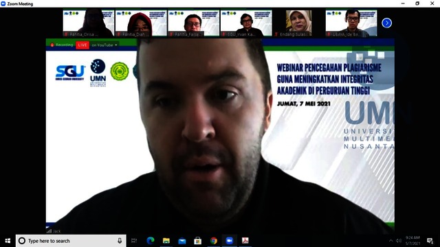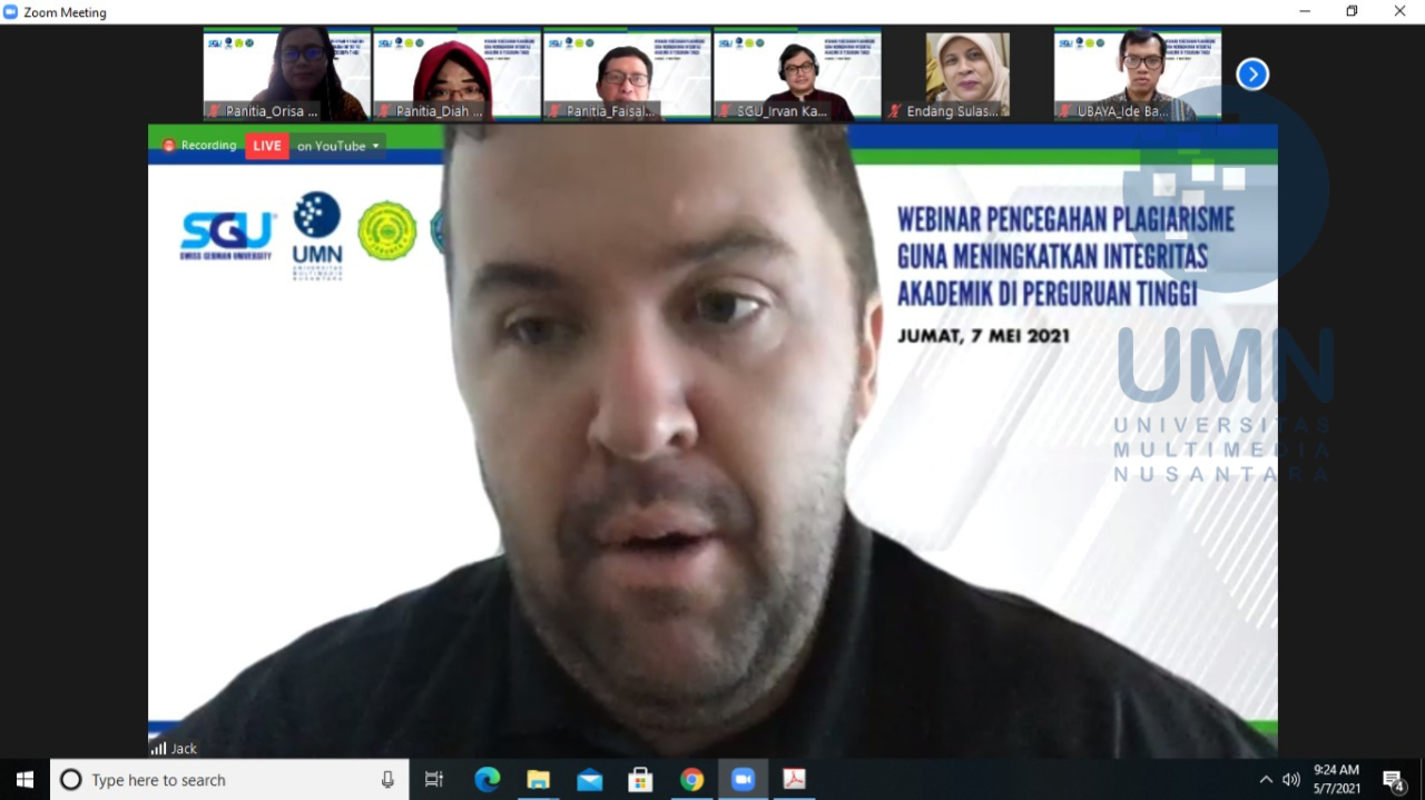 TANGERANG — Pada tanggal 7 Mei 2021, telah diselenggarakan Seminar Pencegahan Plagiarisme yang merupakan kolaborasi antara Swiss German University (SGU) dan Universitas Multimedia Nusantara (UMN). Kegiatan ini diadakan sebagai bentuk komitmen bersama kedua perguruan tinggi dalam meningkatkan kesadaran akademik mengenai pentingnya kejujuran ilmiah dan etika penulisan karya ilmiah di lingkungan pendidikan tinggi. Seminar ini menghadirkan narasumber dari kedua universitas yang memiliki kompetensi di bidang integritas akademik, teknologi deteksi plagiarisme, serta strategi penulisan ilmiah yang sesuai dengan standar etika internasional. Para peserta yang terdiri dari dosen, mahasiswa, dan staf akademik memperoleh wawasan mendalam tentang bentuk-bentuk plagiarisme, dampak yang ditimbulkannya terhadap reputasi akademik, serta cara-cara efektif untuk menghindarinya, baik melalui pemahaman konsep maupun penggunaan perangkat lunak pendeteksi kemiripan teks.