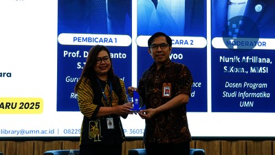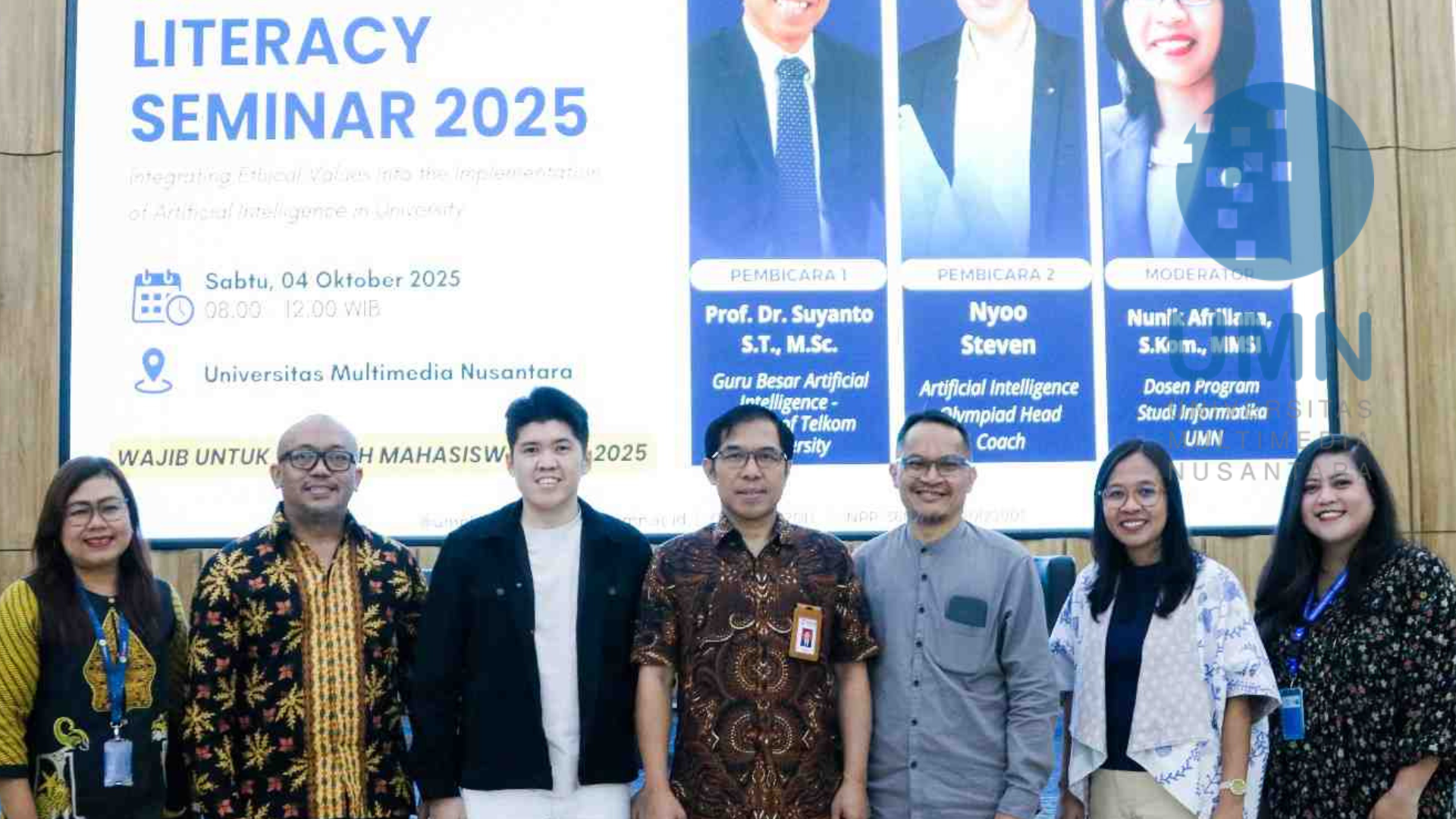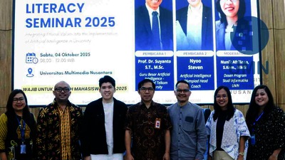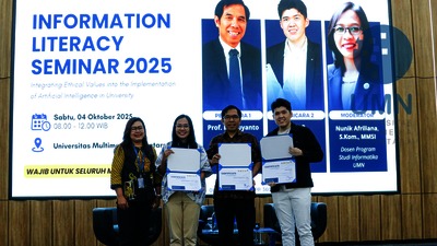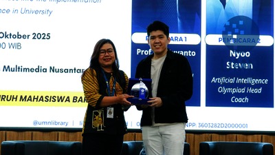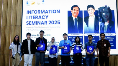 TANGERANG - Perpustakaan UMN menggelar Seminar Information Literacy 2025 bertema “Integrating Ethical Values into the Implementation of Artificial Intelligence in University”. Seminar menghadirkan Prof. Dr. Suyanto, S.T., M.Sc. (Guru Besar AI dan Rektor Telkom University) serta Nyoo Steven (AI Olympiad Head Coach), dengan moderator Nunik Afriliana, S.Kom., MMSI. (Dosen Informatika UMN). Kegiatan ini membahas dasar-dasar AI, penerapannya secara etis di lingkungan akademik, pedoman penggunaan AI di perguruan tinggi, serta tips menjaga keamanan data pribadi.