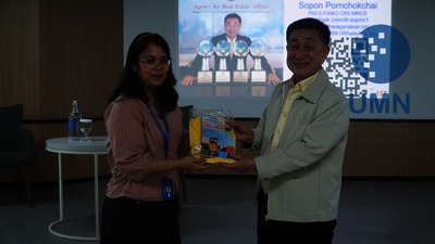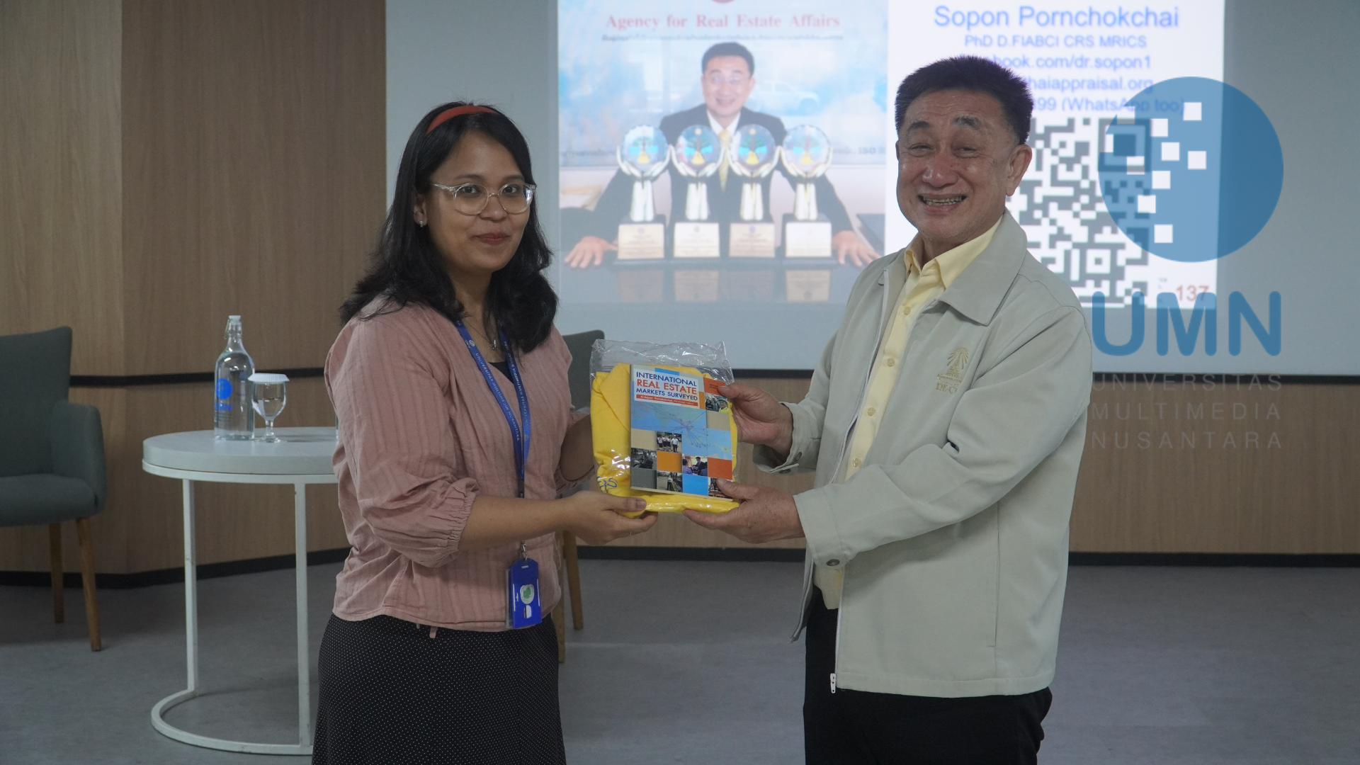 TANGERANG - Program Studi Profesi Arsitektur (PPAR) UMN mengadakan kuliah umum bertajuk “Exploring Property Value after Natural Disasters in Southeast Asia” bersama Dr. Sopon Pornchokchai, Presiden FIABCI Thailand. Dalam sesi ini, Dr. Sopon membagikan berbagai studi kasus di Asia Tenggara yang menunjukkan bagaimana nilai properti dapat pulih bahkan meningkat setelah bencana alam, berkat rekonstruksi dan bantuan internasional. Ia juga menekankan pentingnya pembelajaran sepanjang hayat untuk mendukung perkembangan profesional di bidang arsitektur dan properti.