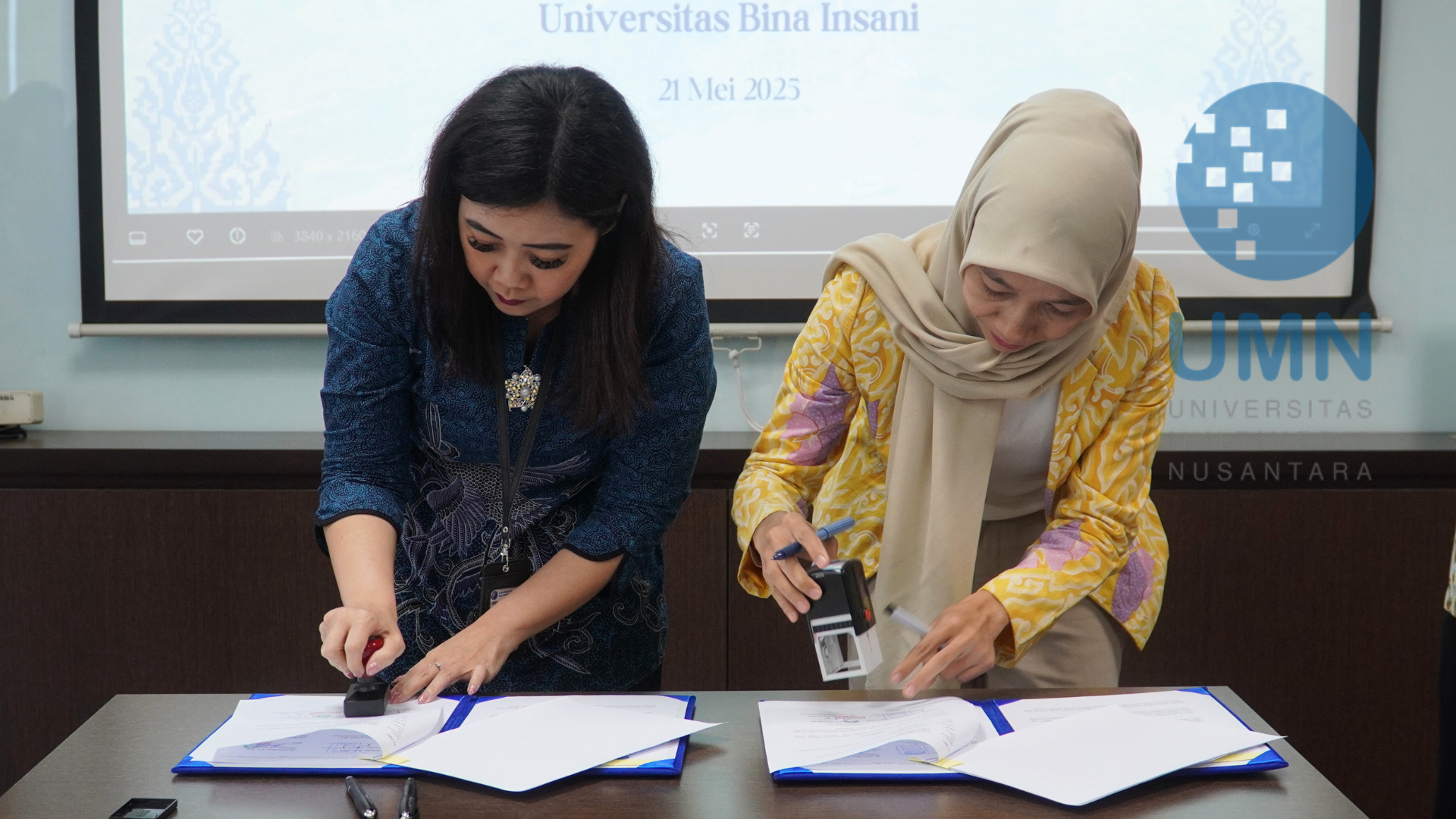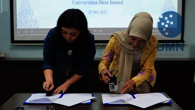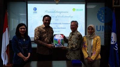 TANGERANG - Universitas Multimedia Nusantara (UMN) resmi menjalin kerja sama dengan Universitas Bina Insani pada 21 Mei 2025. Kolaborasi ini melibatkan Fakultas Seni & Desain UMN dan Fakultas Informatika & Desain Universitas Bina Insani, dengan fokus pada pengembangan pendidikan tinggi di bidang seni dan desain. Kerja sama mencakup kegiatan seperti curriculum benchmarking, pertukaran mahasiswa dan dosen, penelitian bersama, serta penguatan program studi desain komunikasi visual. Melalui kolaborasi ini, kedua institusi berharap dapat mencetak lulusan kreatif, kompeten, dan berwawasan global serta memberikan kontribusi positif bagi dunia pendidikan Indonesia.