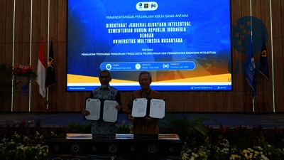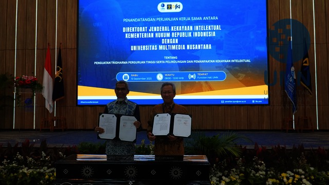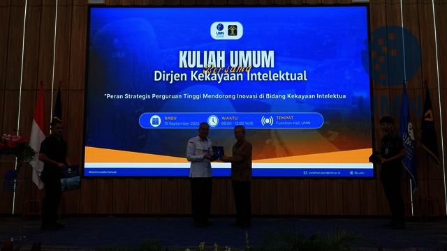 TANGERANG - Universitas Multimedia Nusantara (UMN) menggelar kuliah tamu bersama Direktorat Jenderal Kekayaan Intelektual (DJKI) Kementerian Hukum RI pada Rabu (10/09/2025), membahas peran strategis perguruan tinggi dalam mendorong inovasi melalui Hak Kekayaan Intelektual (HKI). Acara ini juga menjadi momentum peresmian kolaborasi resmi antara UMN dan DJKI sebagai upaya memperkuat perlindungan, pemanfaatan, dan hilirisasi karya intelektual civitas akademika. Para pejabat dari Kementerian Hukum dan HAM, Kemenko Polhukam, serta Rektor UMN menegaskan bahwa perguruan tinggi adalah pusat kreativitas dan inovasi, sehingga HKI perlu diintegrasikan dalam pembelajaran dan diapresiasi sebagai aset ekonomi. Para narasumber utama—Razilu dan Agung Damarsasongko—memaparkan pentingnya pendaftaran HKI, meningkatnya permohonan HKI nasional, isu AI terhadap keaslian karya, serta urgensi literasi HKI bagi mahasiswa dan dosen. Melalui kolaborasi ini, UMN mendorong terciptanya ekosistem akademik yang sadar HKI, melindungi ide kreatif, serta membuka peluang pengembangan penelitian dan inovasi berkelanjutan.