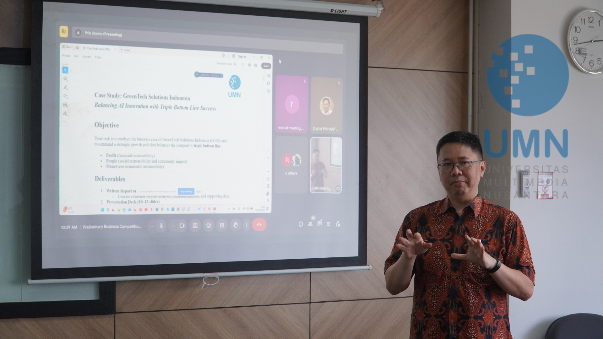Tangerang - Pada (13/10/2025), sebanyak 16 mahasiswa UMN dinyatakan lolos tahap penyisihan International Business Case Competition (IBCC) 2025 dan akan melaju ke semifinal pada Rabu (29/10/2025). Kompetisi ini merupakan hasil kolaborasi antara UMN, Southern Luzon State University (Filipina), serta Tra Vinh University (Vietnam). Wakil Rektor Bidang Kemahasiswaan, Dr. Ika Yanuarti, menyampaikan apresiasi terhadap para peserta dan menekankan bahwa IBCC tidak hanya berfokus pada kompetisi bisnis, tetapi juga pada Artificial Intelligence dan Sustainability, khususnya melalui tiga aspek utama: People, Planet, Profit. Lima tim UMN yang berhasil lolos ke babak semifinal adalah: Entreprenerds, Team AVN, Regent Strategy, Fihh, dan Gain Capital.